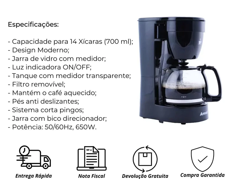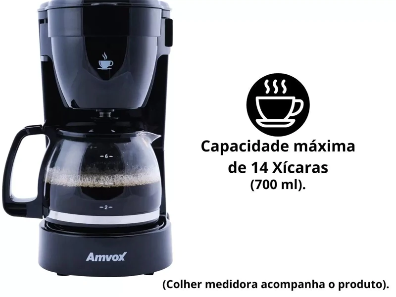 Descrição do ProdutoCafeteira Elétrica Amvox ACF 227 110V New 14 Xícaras PretaA Cafeteira ACF 227 NEW da Amvox é uma ótima opção para o dia a dia. Prática e eficiente, ela faz o café e mantém aquecido pelo resto do dia. Sua jarra de vidro resistente e seus pés anti deslizantes, garantem segurança na hora do preparo. Tem capacidade para 14 xícaras, sendo ideal para sua casa ou escritório. Surpreenda-se com a qualidade desse produto e faça bom proveito.SKD CAFETEIRA AMVOX ACF 227 NEWEspecificações:- Capacidade para 14 Xícaras (700 ml);- Design Moderno;- Jarra de vidro com medidor;- Luz indicadora ON/OFF;- Tanque com medidor transparente;- Filtro removível;- Mantém o café aquecido;- Pés anti deslizantes;- Sistema corta pingos;- Jarra com bico direcionador;- Potência: 50/60Hz, 650W.- Selecione a voltagem do produto no anúncio.Dimensões do Produto:- Comprimento: 16,5 cm;- Largura: 14 cm;- Altura: 26 cm;- Peso: 0,96 kg aproximadamente.Conteúdo da Embalagem:- 1x Cafeteira Amvox ACF 227 New.