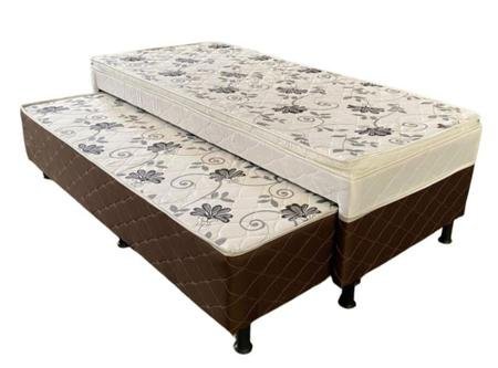 Cama box conjugada, com espuma convencional de densidade D28. Estrutura de madeira 100% reflorestada em sua base e tecido poliéster com tratamento antiácaro, antifungos e antibactericida. Manta 100% poliéster.