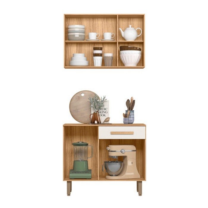 • Conjunto completo: inclui balcão + armário aéreo – suficientes para otimizar espaços de 0,911 m de largura