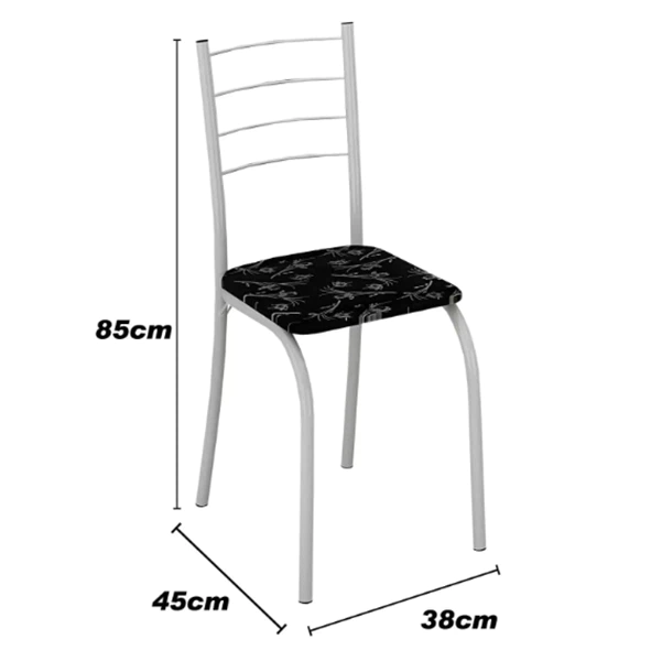 Descrição do ProdutoDimensões da Mesa: Largura 70 cm; Altura 75 cm; Profundidade 70 cm;Dimensões das Cadeiras: Largura 37 cm; Altura 85 cm; Profundidade 41 cm; Distância do assento ao chão: 44 cmPeso suportado por cadeira: 120 kgItens Inclusos: 1 Mesa e 4 CadeirasComplexidade da Montagem: Baixa, pode ser montado por mais de uma pessoa e/ou necessite de maior conhecimento para montagem.Recomendações de Uso, Manutenção e Limpeza: Limpar com flanela ou pano macio seco, não utilizar produtos abrasivos, desengordurantes, álcool ou solvente. Não expor o produto diretamente à luz solar e à umidade.Garantia: 3 meses.