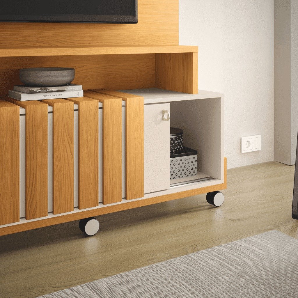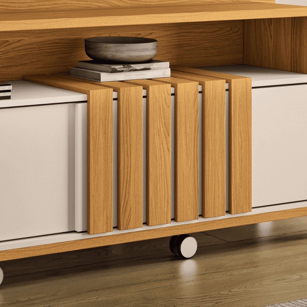 A Estante Home TV HB Móveis Bold é perfeita para transformar sua sala em um ambiente sofisticado e organizado. Seus materiais de alta qualidade garantem durabilidade, enquanto o design moderno com detalhes ripados e puxadores dourados conferem um toque de elegância. Os rodízios cromados facilitam a movimentação, permitindo flexibilidade na disposição dos móveis.