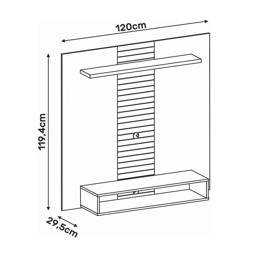 O painel acomoda TVs de até 47 polegadas e possui um nicho espaçoso para aparelhos eletrônicos. A prateleira superior de 25mm oferece espaço adicional para objetos decorativos, complementando o visual do ambiente.