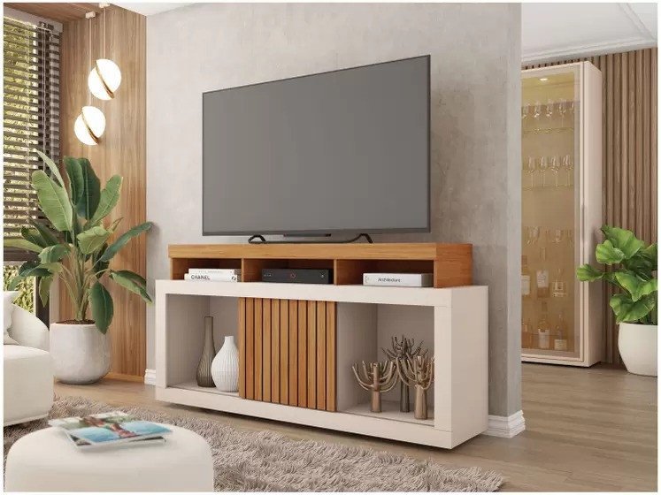 A Bancada para TV Dragon da Caemmun é ideal para quem busca um ambiente moderno e aconchegate. Com espaço que comporta televisores de até 55 polegadas, nichos espaçosos para decoração e eletroeletrônicos, porta de correr com detalhe no ripado em baixo relevo com fundo preto e rodízios embutido caso necessário o deslocamento. É ideal para transformar seu ambiente com resistência, durabilidade e muita modernidade