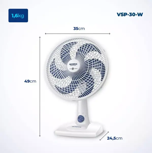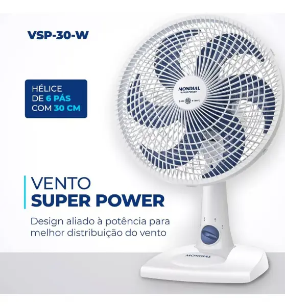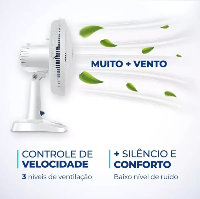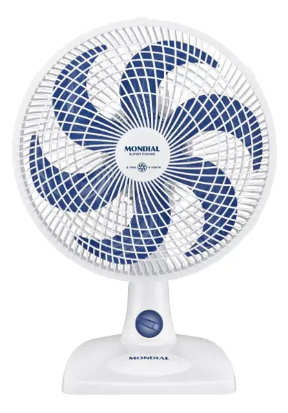 Descrição do ProdutoESPECIFICAÇÕES TÉCNICAS:- Cor: Branco/Azul Escuro- Voltagem (Tensão): 110V- Potência: 60W- Número de velocidades: 3- Quantidade de pás:6- Tipo de ventilador: Ventilador de mesa- Inclinação regulável: Sim- Oscilante:: Sim