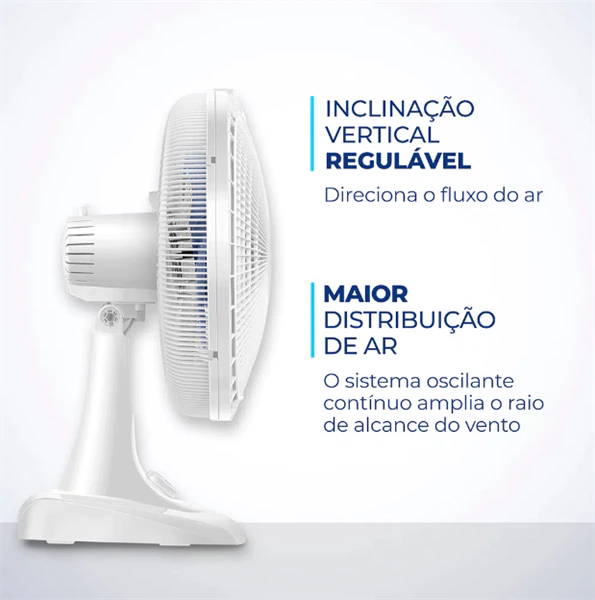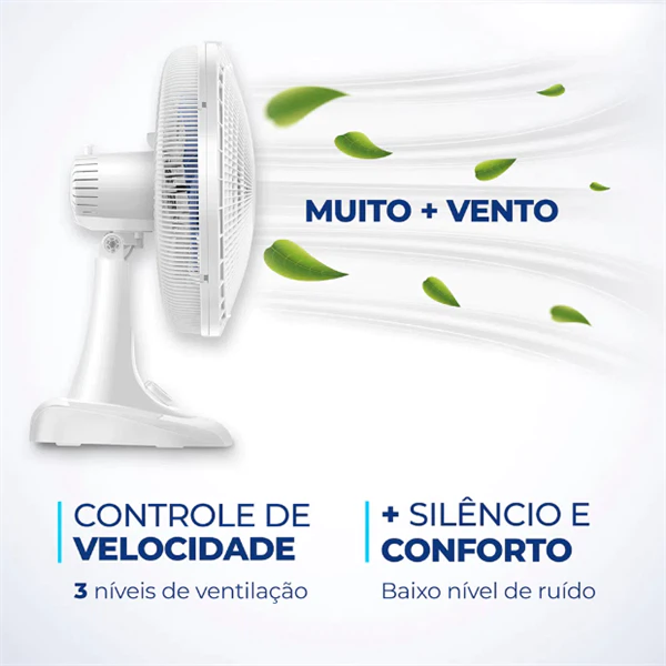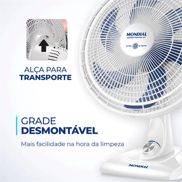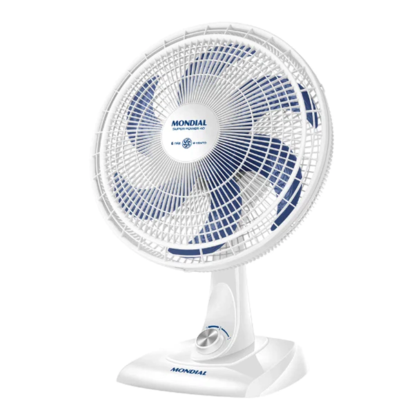 Descrição do ProdutoCom 40cm e 3 velocidades, o ventilador de mesa mondial 6 pás super power vsp-40-w garante vento mais forte. Ele tem baixo nível de ruído, sistema oscilante lateral, inclinação vertical regulável, além ser compacto e ter baixo consumo. Sua hélice tem design aerodinâmico, o que proporciona um vento forte.Como ele faz menos barulho, com qualquer uma das 3 velocidades, você dorme com ventinho e silêncio garantidos. Para ambientes mais amplos, você pode usar seu sistema oscilante. Já sua inclinação vertical regulável direciona o fluxo de ar para cima ou para baixo.Como a grade frontal é removível, ele ainda é fácil de montar e desmontar para limpeza. Ele também é fácil de carregar porque tem uma alça para transporte. Já a base antiderrapante traz mais segurança. O ventilador de mesa mondial 6 pás super power vsp-40-w foi desenvolvido para uso doméstico, sendo melhor para uso residencial. Tudo isso com 1 ano de garantia mondial.